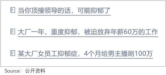 这看似幽默,实则满满都是无奈,“为了在大厂里生存,大家身体或多或少都有点毛病。”林禾叹气,她关注的互联网职场账号,最近几个标题,清一色是谁谁谁又抑郁了,连员工猝死都上不了新闻了,“拿命换钱”成了稀松平常的事情。