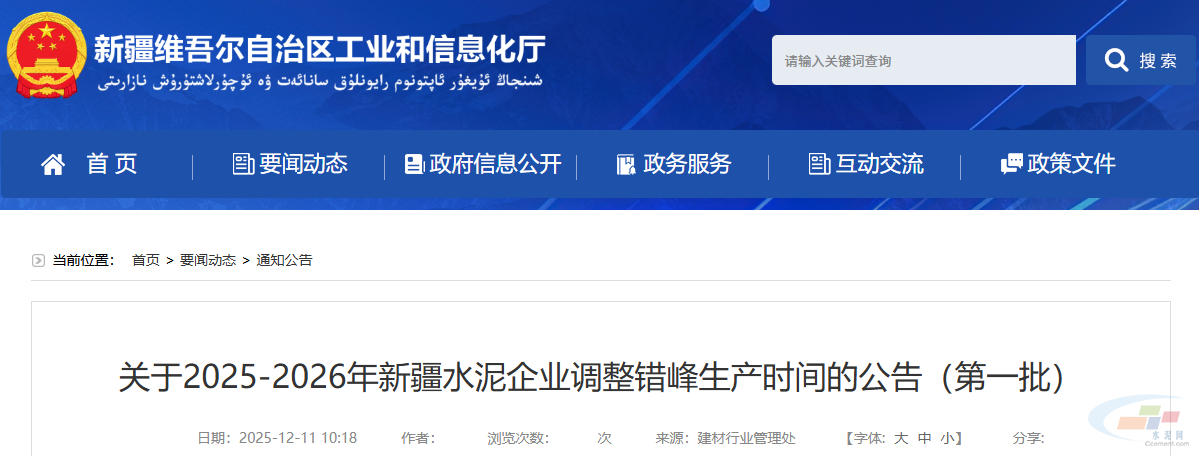 12月11日,新疆维吾尔自治区工业和信息化厅发布关于2025-2026年新疆水泥企业调整错峰生产时间的公告(第一批)。